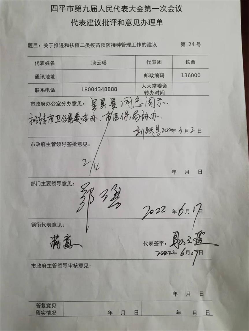 您在四平市九届人大一次会议上提出的《关于推进和扶植二类疫苗预防接种管理工作的建议》收悉,经认真研究办理,现答复如下: