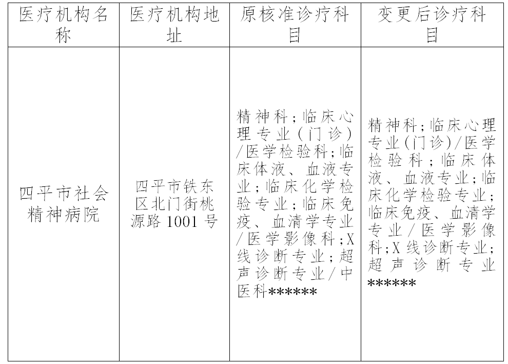 依据《医疗机构管理条例》《医疗机构基本标准》及《卫生部关于医疗机构审批管理的若干规定的通知》(卫医发〔2008〕35号)等相关规定,四平市卫生健康委员会依法受理了四平市社会精神病院关于注销中医科的申请,现将有关信息公示如下:
